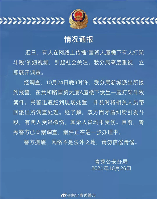 經(jīng)調(diào)查,10月24日晚9時許,我分局新城派出所接到報(bào)警,在共和路國貿(mào)大廈A座樓下發(fā)生一起打架斗毆案件。民警迅速趕到現(xiàn)場處置,并及時將相關(guān)人員帶回派出所調(diào)查處理。經(jīng)了解,雙方因矛盾糾紛引發(fā)斗毆,有兩人受輕微傷,其余人員均未受傷。目前,青秀警方已立案調(diào)查,案件正在進(jìn)一步辦理中。