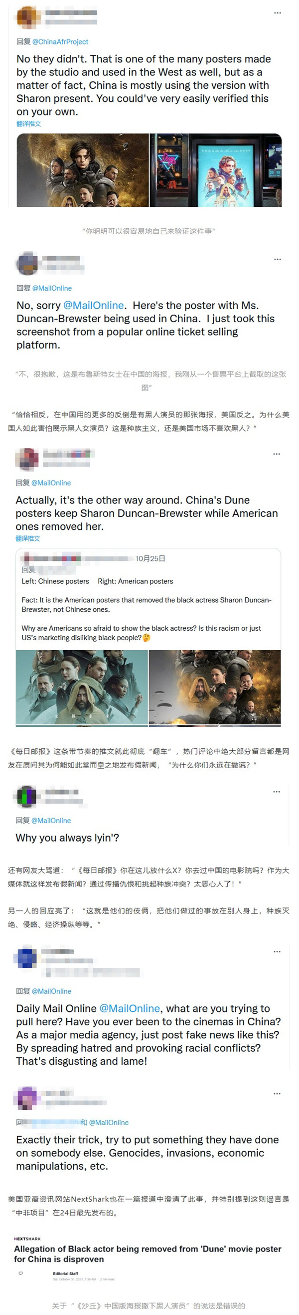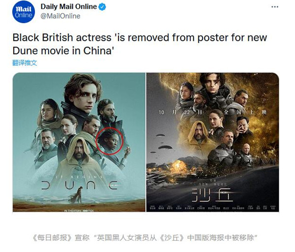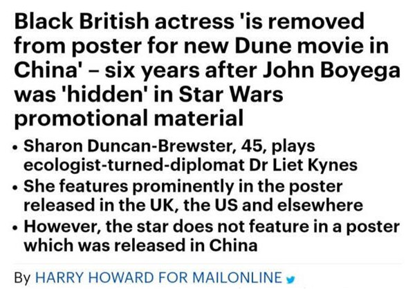 過去一周,英國《每日郵報》《泰晤士報》等外媒都在爭先恐后地炒作同一則假新聞,他們援引美國NGO組織“中國非洲項目”(China Africa Project)組織的說法,聲稱“好萊塢電影《沙丘》的中國版海報將黑人演員替換成了中國演員”,反手就給中國扣了一個“種族歧視”的大帽子。