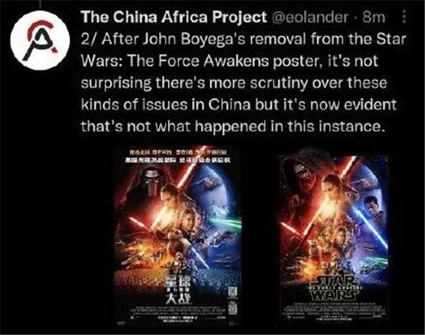 巧了不是,當(dāng)年造謠“《星球大戰(zhàn)7》中國海報縮小黑人演員形象”的也有它。
