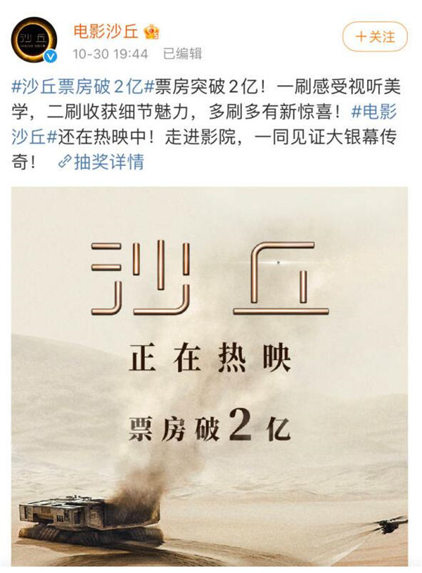 自22日首映后,好萊塢科幻大片《沙丘》在北美院線登頂上周末票房冠軍,攬下4100萬美元(約合人民幣2.61億元)票房,在全球更獲得超2.32億美元(約合人民幣14.81億元)票房,30日影片在中國大陸的票房也突破了2億元人民幣。