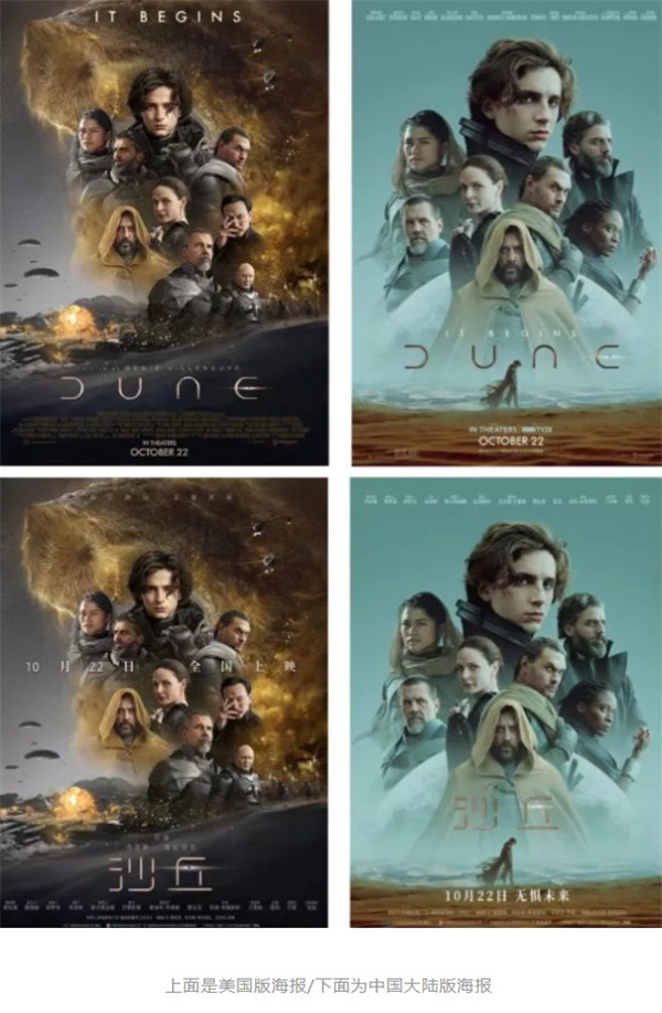 在網(wǎng)上簡單查證一下就能發(fā)現(xiàn),《沙丘》在中國市場推廣時使用了多個版本的海報,讓《每日郵報》“如獲至寶”用來譴責(zé)中國的海報正是其中兩個版本,只是宣傳側(cè)重點不同才會有不同的角色出現(xiàn)。