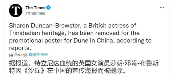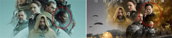 而就在同一天,英國《每日郵報》援引“中非項目”的說法,稱《沙丘》在中國大陸上映時,所使用的宣傳海報刪去了英國黑人女演員莎倫·鄧肯-布魯斯特(Sharon Duncan-Brewster)的肖像,取而代之的是中國臺灣男演員張震。
