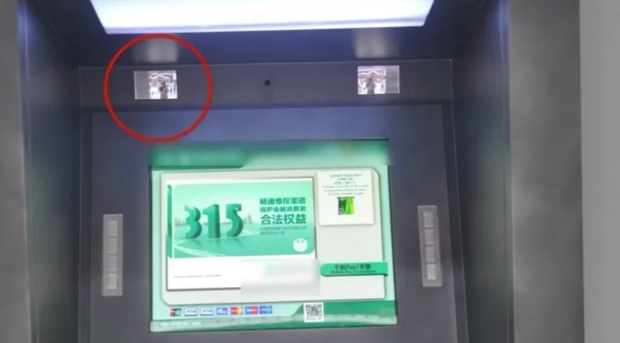 普通的ATM機只有位于機器上方中間位置的一個攝像頭,而這臺ATM機的上方左側(cè)位置竟然還隱秘設有一個針孔攝像頭;