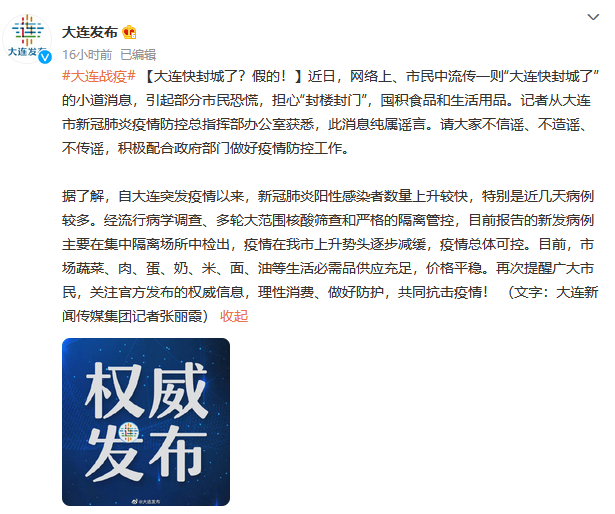 近日,網(wǎng)絡(luò)上、市民中流傳一則“大連快封城了”的小道消息,引起部分市民恐慌,擔(dān)心“封樓封門”,囤積食品和生活用品。記者從大連市新冠肺炎疫情防控總指揮部辦公室獲悉,此消息純屬謠言。請大家不信謠、不造謠、不傳謠,積極配合政府部門做好疫情防控工作。