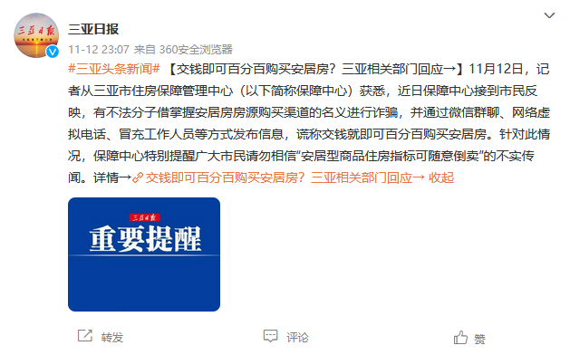 11月9日起,海南三亞啟動(dòng)某安居房申報(bào)工作,合格申請(qǐng)人踴躍開展網(wǎng)上申請(qǐng),申請(qǐng)人數(shù)不斷增多。因此一些不法分子以出售認(rèn)購指標(biāo)、轉(zhuǎn)讓房源等方式實(shí)施詐騙。這些不法分子聲稱“掌握安居房房源購買渠道,交錢就可百分百購買安居房”。