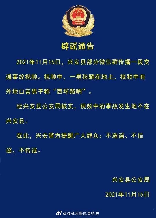 2021年11月15日,興安縣部分微信群傳播一段交通事故視頻,視頻中,一男孩躺在地上,視頻中有外地口音男子稱“西環(huán)路吶”。經(jīng)興安縣公安局核實,視頻中的事故發(fā)生地不在興安縣。