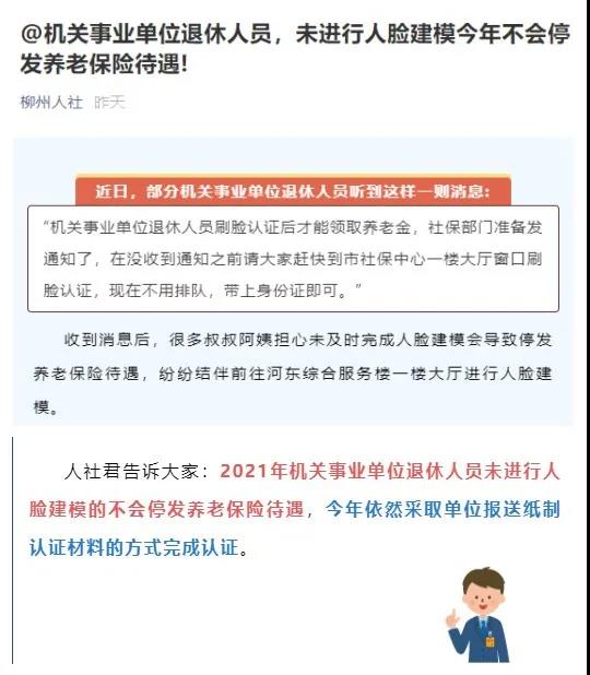 柳州市社會(huì)保險(xiǎn)事業(yè)管理中心表示:2021年機(jī)關(guān)事業(yè)單位退休人員未進(jìn)行人臉建模的不會(huì)停發(fā)養(yǎng)老保險(xiǎn)待遇,今年依然采取單位報(bào)送紙制認(rèn)證材料的方式完成認(rèn)證。