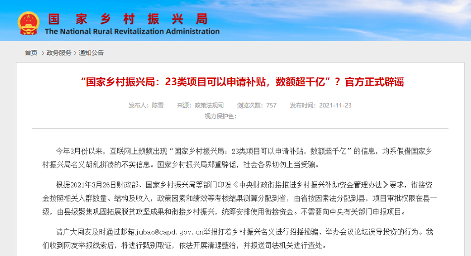 國(guó)家鄉(xiāng)村振興局于11月23日通過官方渠道發(fā)布辟謠聲明,此類信息均系假借官方名義,胡亂拼湊的不實(shí)信息,社會(huì)各界切勿上當(dāng)受騙。