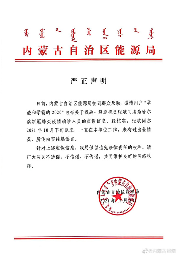 內(nèi)蒙古能源局在聲明中稱:日前,內(nèi)蒙古自治區(qū)能源局接到群眾反映,微博用戶“學(xué)渣和學(xué)霸的2020”散布關(guān)于我局一級巡視員張斌同志為哈爾濱新冠肺炎疫情確診人員的虛假信息。經(jīng)核實,張斌同志2021年10月下旬以來,一直在本單位工作,未有過出差情況,所傳內(nèi)容純屬謠言。