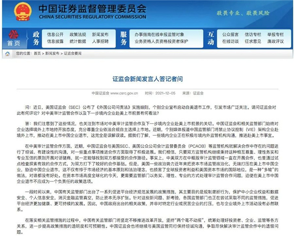 12月5日,證監(jiān)會(huì)新聞發(fā)言人就美國(guó)證監(jiān)會(huì)(SEC)公布的《外國(guó)公司問(wèn)責(zé)法》實(shí)施細(xì)則進(jìn)行答記者問(wèn)。