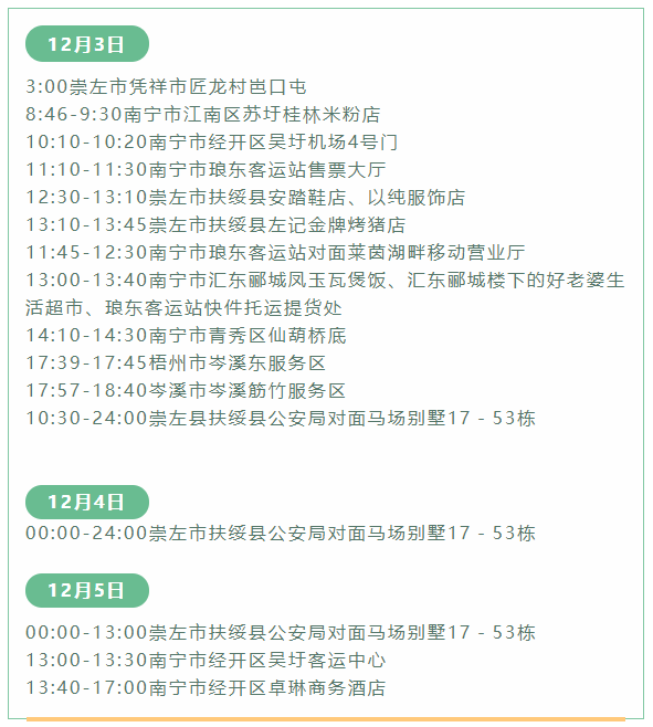 2021年12月5日,福建和廣西各報(bào)告1名非法入境人員新冠病毒核酸檢測(cè)陽(yáng)性,其中1人由南寧坐大巴抵達(dá)福建安溪縣,另1人在南寧,目前2名陽(yáng)性感染者均已隔離管控。根據(jù)流調(diào)結(jié)果,為做好疫情防控工作,廣西疾控中心公布2名陽(yáng)性感染者在我區(qū)活動(dòng)軌跡,請(qǐng)與其有時(shí)空重合人員立即主動(dòng)報(bào)備并配合落實(shí)核酸檢測(cè)等防控措施!