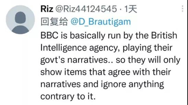 網(wǎng)友Riz評論稱:“BBC基本上由英國情報機構(gòu)運營,所以他們只會發(fā)表與英國情報機構(gòu)敘述相符的內(nèi)容,而忽略任何與之相反的內(nèi)容。”