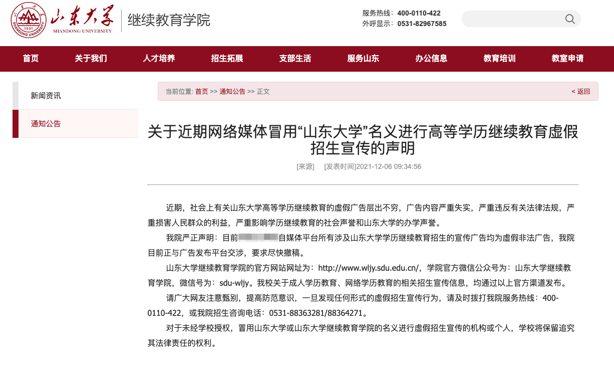 12月6日,山東大學(xué)繼續(xù)教育學(xué)院發(fā)布官方聲明,目前自媒體平臺所有涉及山東大學(xué)學(xué)歷繼續(xù)教育招生的宣傳廣告均為虛假非法廣告。這些虛假廣告層出不窮,內(nèi)容嚴(yán)重失實(shí),嚴(yán)重違反有關(guān)法律法規(guī),損害人民群眾的利益,影響學(xué)歷繼續(xù)教育的社會聲譽(yù)和山東大學(xué)的辦學(xué)聲譽(yù)。