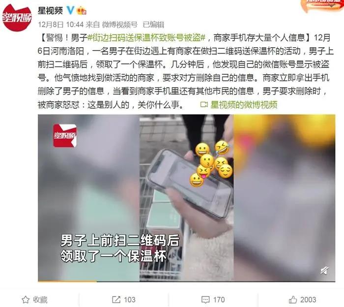 近日,有消息稱,一男子在街邊遇到有商家在做“掃二維碼送保溫杯”的活動(dòng),該男子上前掃描二維碼后,領(lǐng)取了一個(gè)保溫杯。然而幾分鐘后,他發(fā)現(xiàn)自己的微信賬號顯示被盜號。