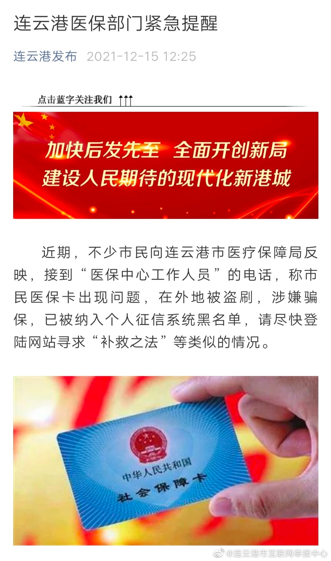 近期,不少市民向連云港市醫(yī)療保障局反映,接到“醫(yī)保中心工作人員”的電話,稱市民醫(yī)??ǔ霈F(xiàn)問題,在外地被盜刷,涉嫌騙保,已被納入個人征信系統(tǒng)黑名單,請盡快登陸網(wǎng)站尋求“補(bǔ)救之法”等類似的情況。