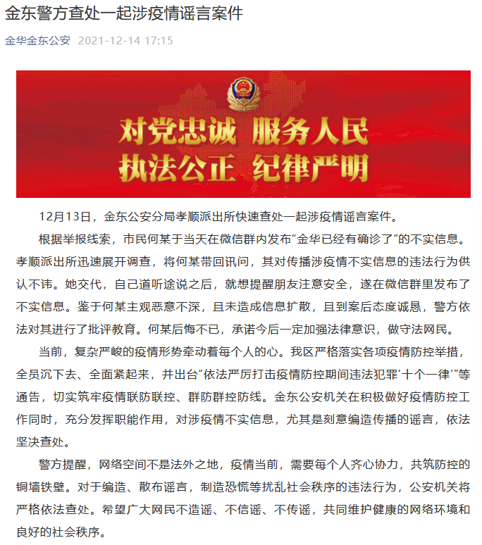 12月13日,金東公安分局孝順派出所快速查處一起涉疫情謠言案件。根據(jù)舉報線索,市民何某于當(dāng)天在微信群內(nèi)發(fā)布“金華已經(jīng)有確診了”的不實信息。孝順派出所迅速展開調(diào)查,將何某帶回訊問,其對傳播涉疫情不實信息的違法行為供認不諱。她交代,自己道聽途說之后,就想提醒朋友注意安全,遂在微信群里發(fā)布了不實信息。鑒于何某主觀惡意不深,且未造成信息擴散,且到案后態(tài)度誠懇,警方依法對其進行了批評教育。何某后悔不已,承諾今后一定加強法律意識,做守法網(wǎng)民。
