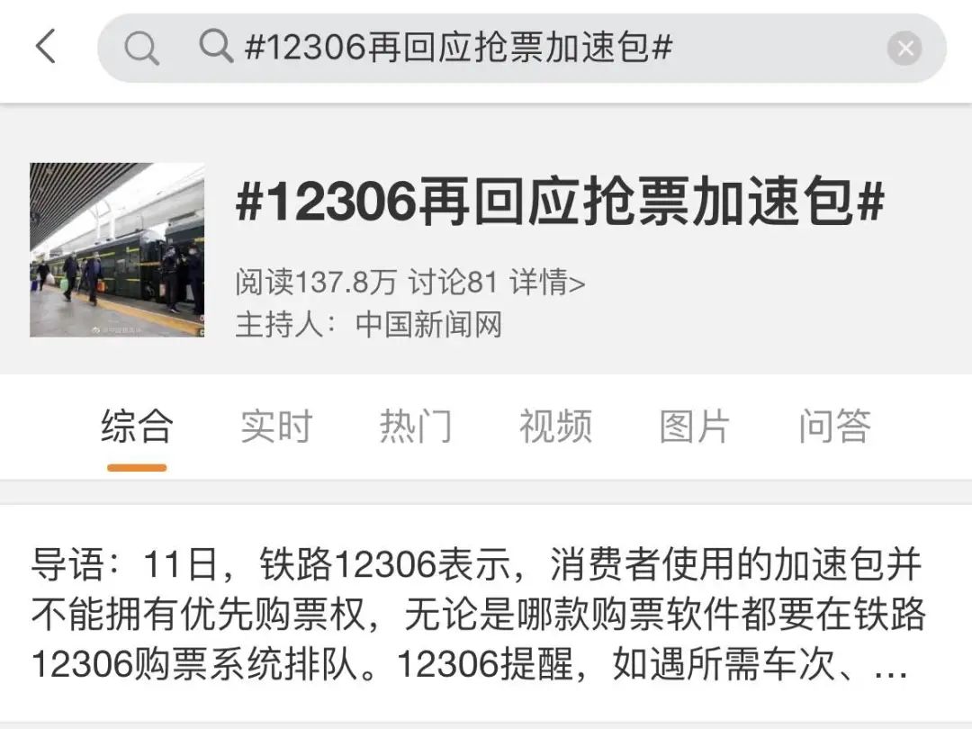 11日,鐵路12306表示,消費(fèi)者使用的加速包并不能擁有優(yōu)先購(gòu)票權(quán),無(wú)論是哪款購(gòu)票軟件都要在鐵路12306購(gòu)票系統(tǒng)排隊(duì)。