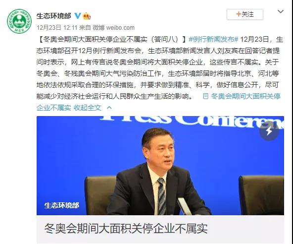 12月23日,生態(tài)環(huán)境部召開(kāi)12月例行新聞發(fā)布會(huì),生態(tài)環(huán)境部新聞發(fā)言人劉友賓在回答記者提問(wèn)時(shí)表示,網(wǎng)上有傳言說(shuō)冬奧會(huì)期間將大面積關(guān)停企業(yè),這些傳言不屬實(shí)。關(guān)于冬奧會(huì)、冬殘奧會(huì)期間大氣污染防治工作,生態(tài)環(huán)境部屆時(shí)將指導(dǎo)北京、河北等地依法依規(guī)采取合理的環(huán)保措施,并要求做到精準(zhǔn)、科學(xué),做好信息公開(kāi),盡可能減少對(duì)經(jīng)濟(jì)社會(huì)運(yùn)行和人民群眾生產(chǎn)生活的影響。
