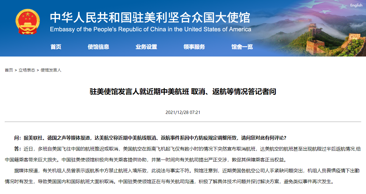 中國駐美國大使館網(wǎng)站28日消息,駐美使館發(fā)言人就近期中美航班取消、返航等情況答記者問。