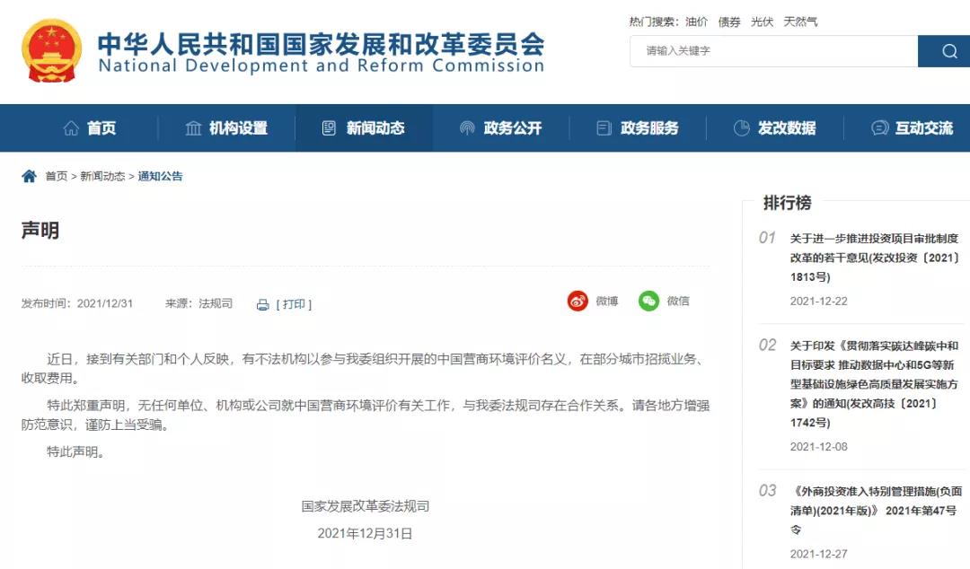 據(jù)國家發(fā)展改革委官網(wǎng)消息,近日,國家發(fā)展改革委接到有關(guān)部門和個人反映,有不法機(jī)構(gòu)以參與國家發(fā)展改革委組織開展的中國營商環(huán)境評價名義,在部分城市招攬業(yè)務(wù)、收取費用。