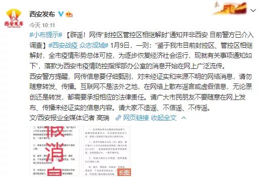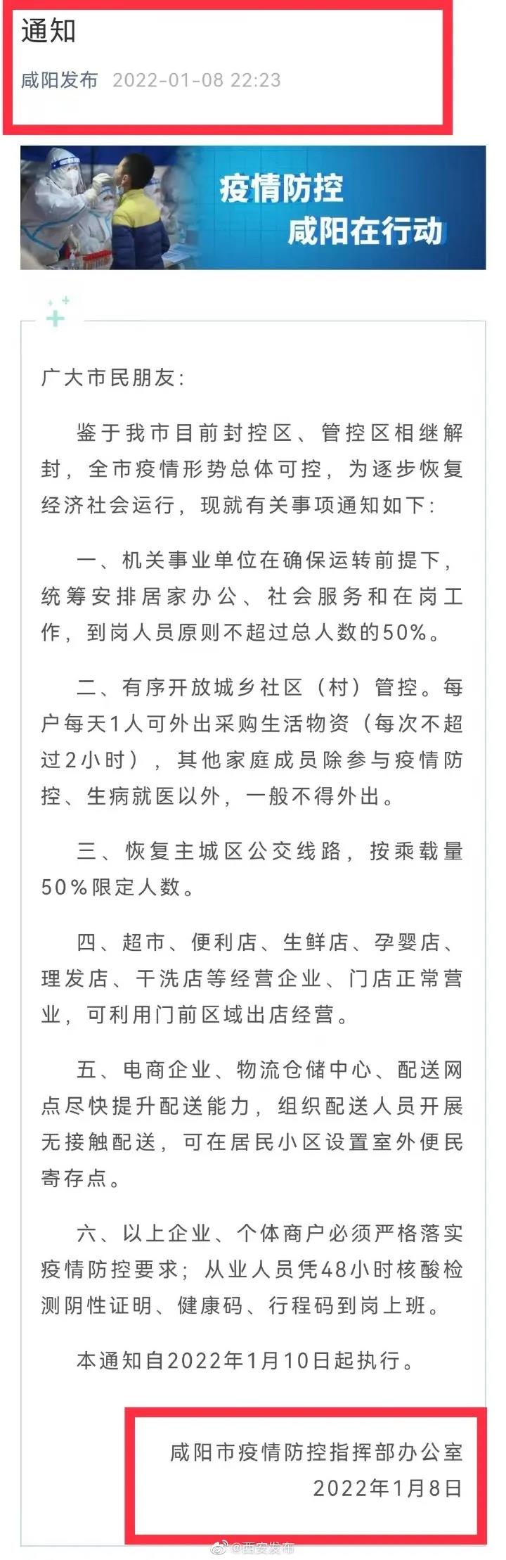 據(jù)西安發(fā)布官方微博消息,1月9日,一則:“鑒于我市目前封控區(qū)、管控區(qū)相繼解封,全市疫情形勢總體可控,為逐步恢復(fù)經(jīng)濟社會運行,現(xiàn)就有關(guān)事項通知如下”,落款為西安市疫情防控指揮部辦公室的消息開始在網(wǎng)上廣泛流傳。