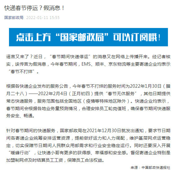 近日,“春節(jié)期間快遞停運”的消息又在網(wǎng)絡(luò)上傳播開來。經(jīng)記者核實,該傳言為假消息,今年春節(jié)期間,EMS、順豐、京東物流等主要寄遞企業(yè)均表示“春節(jié)不打烊”。