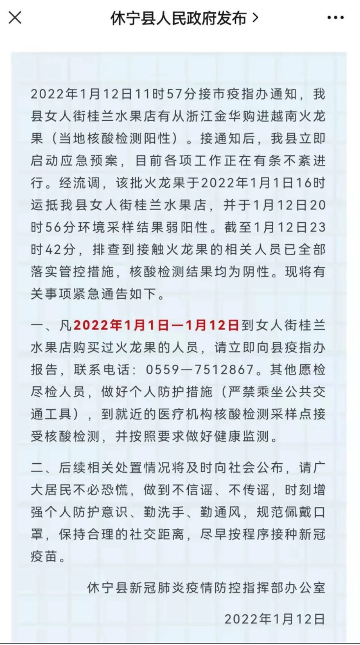 同日,安徽省黃山市休寧縣發(fā)布緊急尋人通告稱,一水果店有從浙江金華購進的越南火龍果(當?shù)睾怂釞z測陽性)。