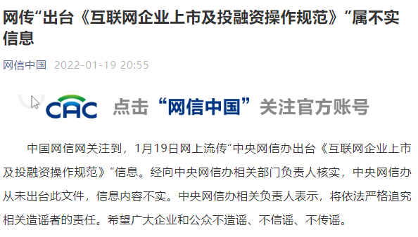 中國網(wǎng)信網(wǎng)關(guān)注到,1月19日網(wǎng)上流傳“中央網(wǎng)信辦出臺《互聯(lián)網(wǎng)企業(yè)上市及投融資操作規(guī)范》”信息。經(jīng)向中央網(wǎng)信辦相關(guān)部門負責(zé)人核實,中央網(wǎng)信辦從未出臺此文件,信息內(nèi)容不實。中央網(wǎng)信辦相關(guān)負責(zé)人表示,將依法嚴格追究相關(guān)造謠者的責(zé)任。希望廣大企業(yè)和公眾不造謠、不信謠、不傳謠。