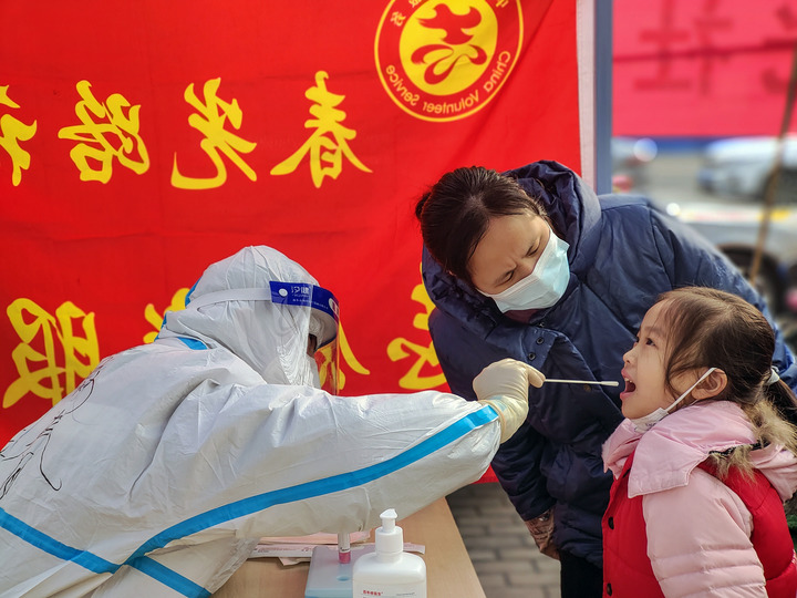 在安陽市文峰區(qū)紫薇大道街道春光路社區(qū),醫(yī)護人員為一名小朋友進行核酸檢測取樣(1月11日 麻翛然攝)