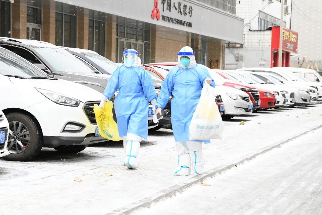 ▲2022年1月20日,在河北石家莊新樂市街頭,新樂市醫(yī)院兩名醫(yī)務(wù)人員冒雪準備入戶采集核酸。(視覺中國)