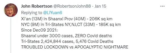 ▲西安人口1300萬,陜西人口4000萬,紐約人口900萬,從2021年12月9日以來,陜西感染不到3000例,0死亡,而紐約所在的三州,感染2424844例,死亡5476……這就是作者眼中的“麻煩的封鎖”和“災(zāi)難性噩夢”。