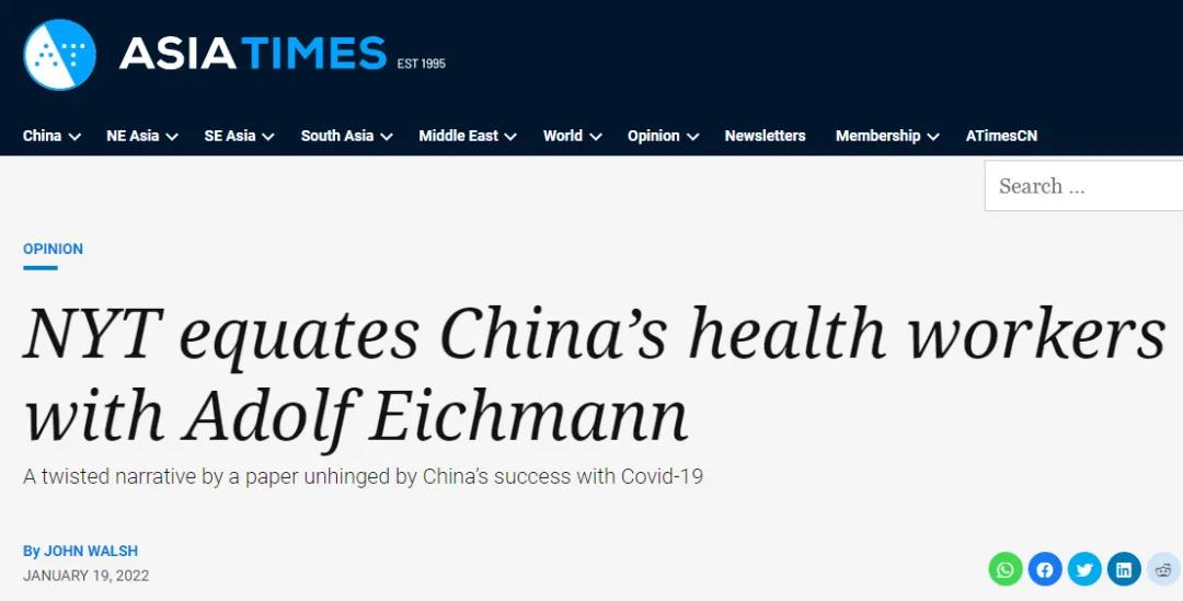 曾就任于美國馬薩諸塞大學(xué)醫(yī)學(xué)院的生理學(xué)和細胞神經(jīng)科學(xué)專家約翰·沃爾什,在一篇最近發(fā)表于《亞洲時報》的文章中一針見血地指出,《紐約時報》之所以將中國衛(wèi)生工作者比作阿道夫·艾希曼,背后是該報因中國抗疫成功而導(dǎo)致精神錯亂下的“扭曲敘事”。