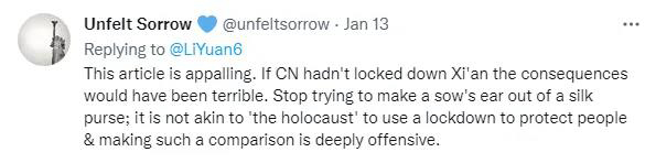 ▲這篇報道非常令人震驚。如果沒有采取封鎖西安的后果會嚴重得多。不要再試圖用豬耳朵做出錢包來了。用封鎖措施保護人民跟“大屠殺”一點關(guān)系都沒有,這個說法是嚴重的挑釁。