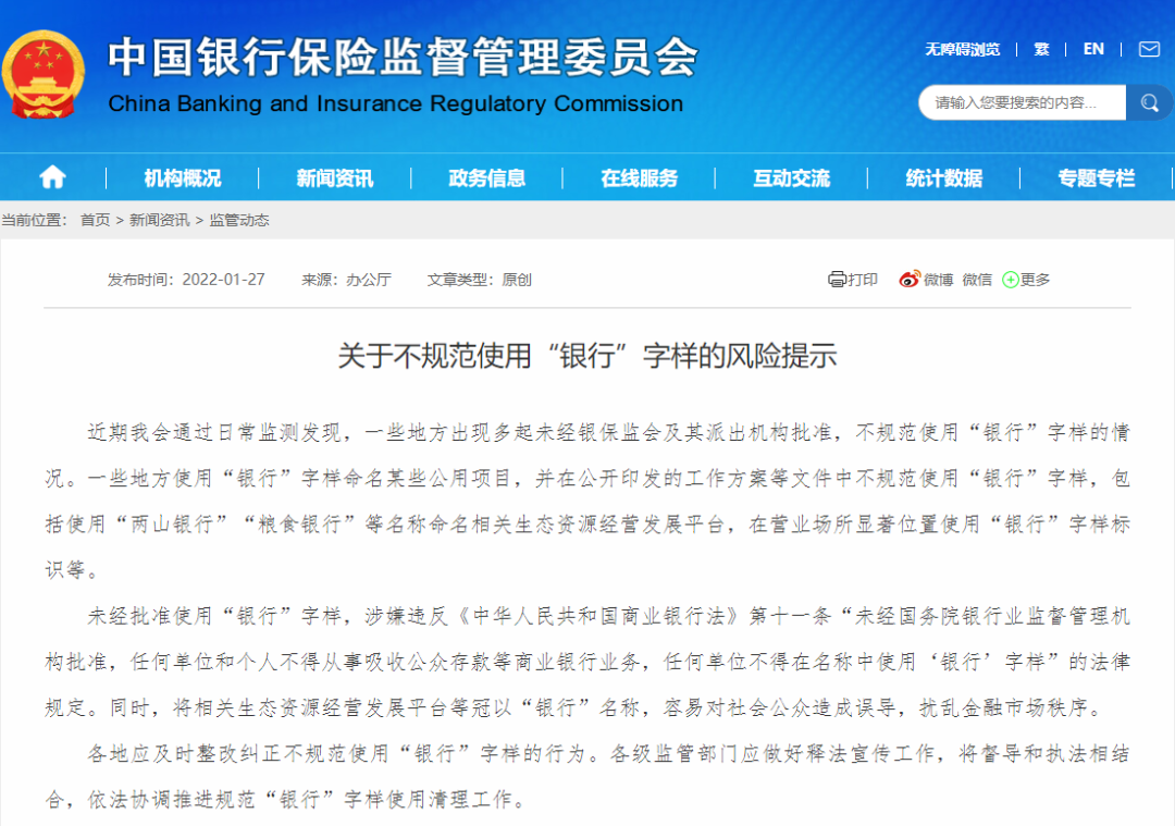 近期,銀保監(jiān)會通過日常監(jiān)測發(fā)現(xiàn),一些地方出現(xiàn)多起未經(jīng)銀保監(jiān)會及其派出機(jī)構(gòu)批準(zhǔn),不規(guī)范使用“銀行”字樣的情況。比如,一些地方使用“銀行”字樣命名某些公用項(xiàng)目,并在公開印發(fā)的工作方案等文件中不規(guī)范使用“銀行”字樣,包括使用“兩山銀行”“糧食銀行”等名稱命名相關(guān)生態(tài)資源經(jīng)營發(fā)展平臺,在營業(yè)場所顯著位置使用“銀行”字樣標(biāo)識等。