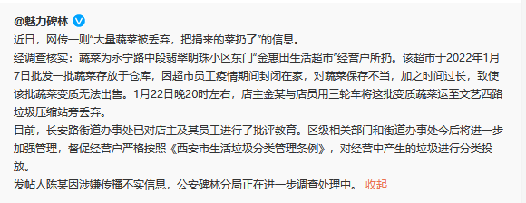 經(jīng)調(diào)查核實:蔬菜為永寧路中段翡翠明珠小區(qū)東門“金惠田生活超市”經(jīng)營戶所扔。該超市于2022年1月7日批發(fā)一批蔬菜存放于倉庫,因超市員工疫情期間封閉在家,對蔬菜保存不當,加之時間過長,致使該批蔬菜變質(zhì)無法出售。1月22日晚20時左右,店主金某與店員用三輪車將這批變質(zhì)蔬菜運至文藝西路垃圾壓縮站旁丟棄。