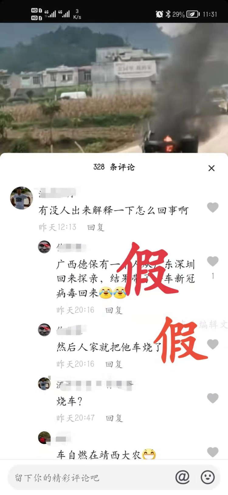 經(jīng)調(diào)查核實(shí),被燒毀的轎車是2月5日在百色市靖西市龍臨鎮(zhèn)大農(nóng)村附近公路上發(fā)生自燃的車輛,車主當(dāng)時(shí)已向靖西市消防大隊(duì)報(bào)警,視頻中反映的事實(shí)與網(wǎng)友評(píng)論不相符,廣西德??h新冠肺炎確診病例的車輛被燒毀是不實(shí)信息,目前,德保警方已介入。