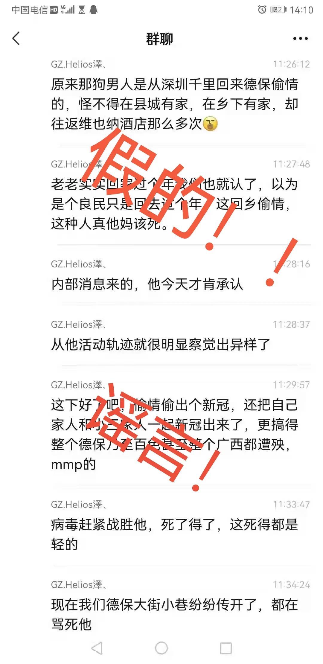 近日,多張“廣西百色德保毒王許某某從深圳回德保偷情引發(fā)新冠疫情”的微信聊天記錄在社交平臺上引發(fā)熱議,有網(wǎng)友對許某某進行攻擊,稱其“德保毒王”等等,這些言論造成了很大的負(fù)面影響。經(jīng)排查,網(wǎng)傳消息不屬實,許某某系回村吃飯時造成多人傳染。