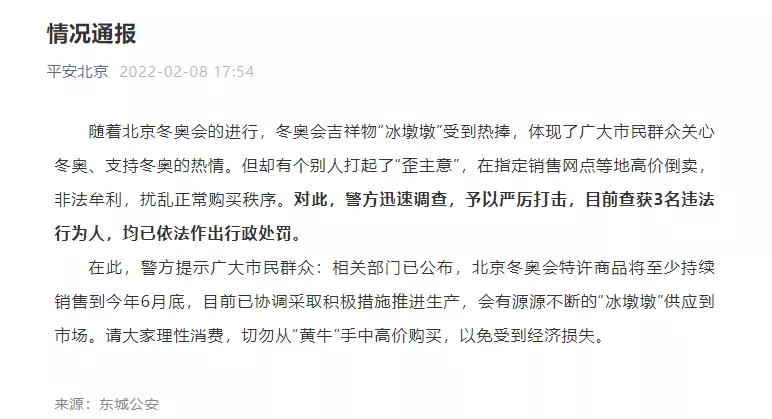 據(jù)北京市公安局東城分局微信公眾號消息,隨著北京冬奧會(huì)的進(jìn)行,冬奧會(huì)吉祥物“冰墩墩”受到熱捧,體現(xiàn)了廣大市民群眾關(guān)心冬奧、支持冬奧的熱情。但卻有個(gè)別人打起了“歪主意”,在指定銷售網(wǎng)點(diǎn)等地高價(jià)倒賣,非法牟利,擾亂正常購買秩序。對此,警方迅速調(diào)查,予以嚴(yán)厲打擊,目前查獲3名違法行為人,均已依法作出行政處罰。