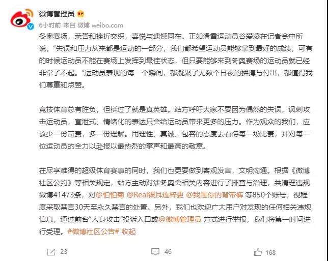 2月9日,根據(jù)《微博社區(qū)公約》等相關(guān)規(guī)定,微博站方主動(dòng)對(duì)涉冬奧會(huì)相關(guān)內(nèi)容進(jìn)行了排查與治理,共清理違規(guī)微博41473條,對(duì)850個(gè)賬號(hào),視程度采取禁言30天至永久禁言的處置。