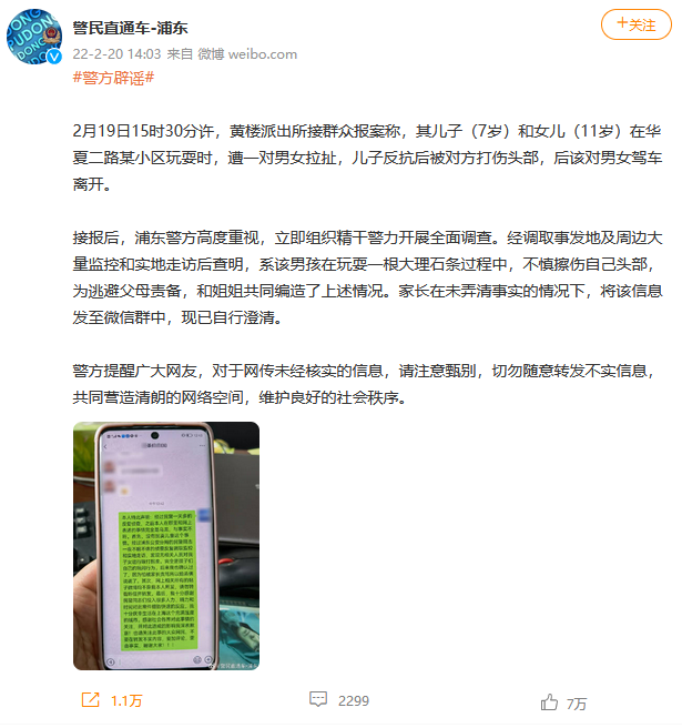 接報(bào)后,浦東警方高度重視,立即組織精干警力開展全面調(diào)查。經(jīng)調(diào)取事發(fā)地及周邊大量監(jiān)控和實(shí)地走訪后查明,系該男孩在玩耍一根大理石條過程中,不慎擦傷自己頭部,為逃避父母責(zé)備,和姐姐共同編造了上述情況。家長在未弄清事實(shí)的情況下,將該信息發(fā)至微信群中,現(xiàn)已自行澄清。