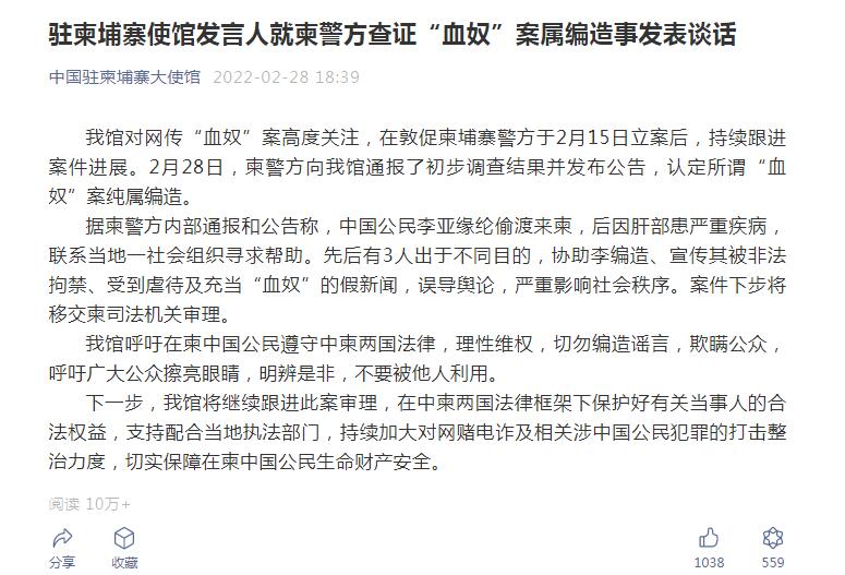 2月28日18時30分許,中國駐柬埔寨大使館微信公號發(fā)布文章《駐柬埔寨使館發(fā)言人就柬警方查證“血奴”案屬編造事發(fā)表談話》。