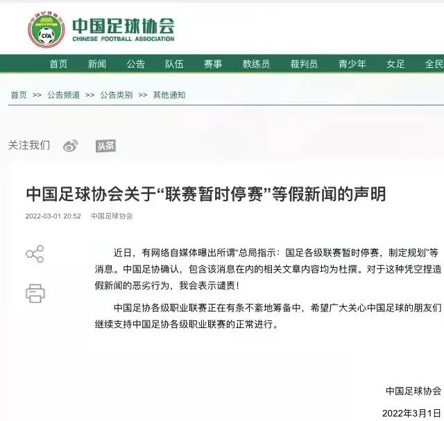 “近日,有網(wǎng)絡(luò)自媒體曝出所謂‘(體育)總局指示:國(guó)足各級(jí)聯(lián)賽暫時(shí)停賽,制定規(guī)劃’等消息。中國(guó)足協(xié)確認(rèn),包含該消息在內(nèi)的相關(guān)文章內(nèi)容均為杜撰。對(duì)于這種憑空捏造假新聞的惡劣行為,我會(huì)表示譴責(zé)!”中國(guó)足協(xié)在聲明中說(shuō)。