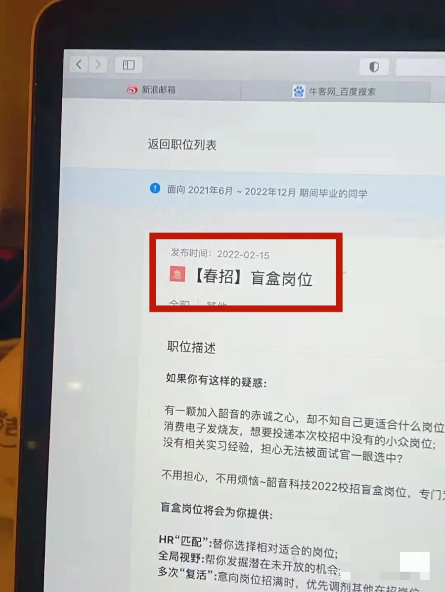 2月19日,有網(wǎng)友上傳了一張照片,“這兩天瘋狂投簡(jiǎn)歷,突然看到這個(gè),春招還開盲盒哈哈哈哈哈……”