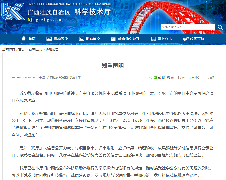 對此,我廳鄭重聲明,該類情況不可信。請廣大項(xiàng)目申報(bào)單位及科研工作者切勿輕信中介機(jī)構(gòu)該類說法。為構(gòu)建公平、公正、科學(xué)、規(guī)范的科研項(xiàng)目立項(xiàng)評審機(jī)制,廣西科技計(jì)劃項(xiàng)目立項(xiàng)工作在廣西科技管理信息平臺(tái)(以下簡稱“桂科管系統(tǒng)”)嚴(yán)格按照管理流程實(shí)行“一站式”在線閉環(huán)管理,系統(tǒng)對項(xiàng)目全過程管理留痕,支持“可申訴、可查詢、可追溯”。