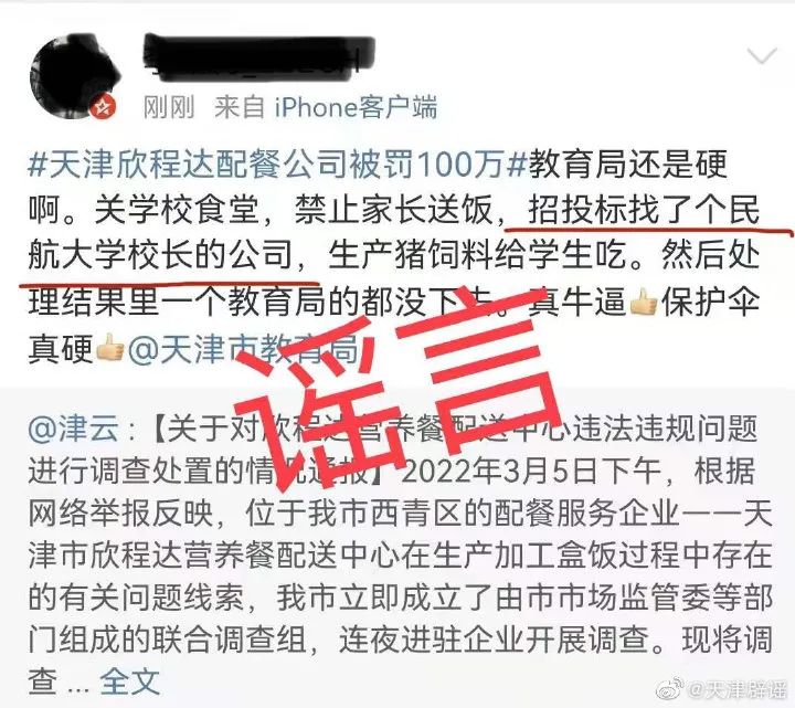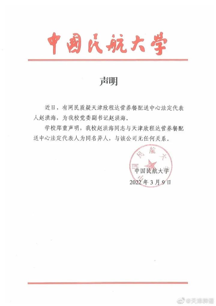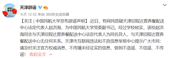 據(jù)@天津辟謠 發(fā)布消息稱,近日,有網(wǎng)民質(zhì)疑天津欣程達營養(yǎng)餐配送中心法定代表人趙洪海,為中國民航大學黨委副書記。經(jīng)過學校核實,該校趙洪海同志與天津欣程達營養(yǎng)餐配送中心法定代表人為同名異人,與天津欣程達營養(yǎng)餐配送中心無任何關系。