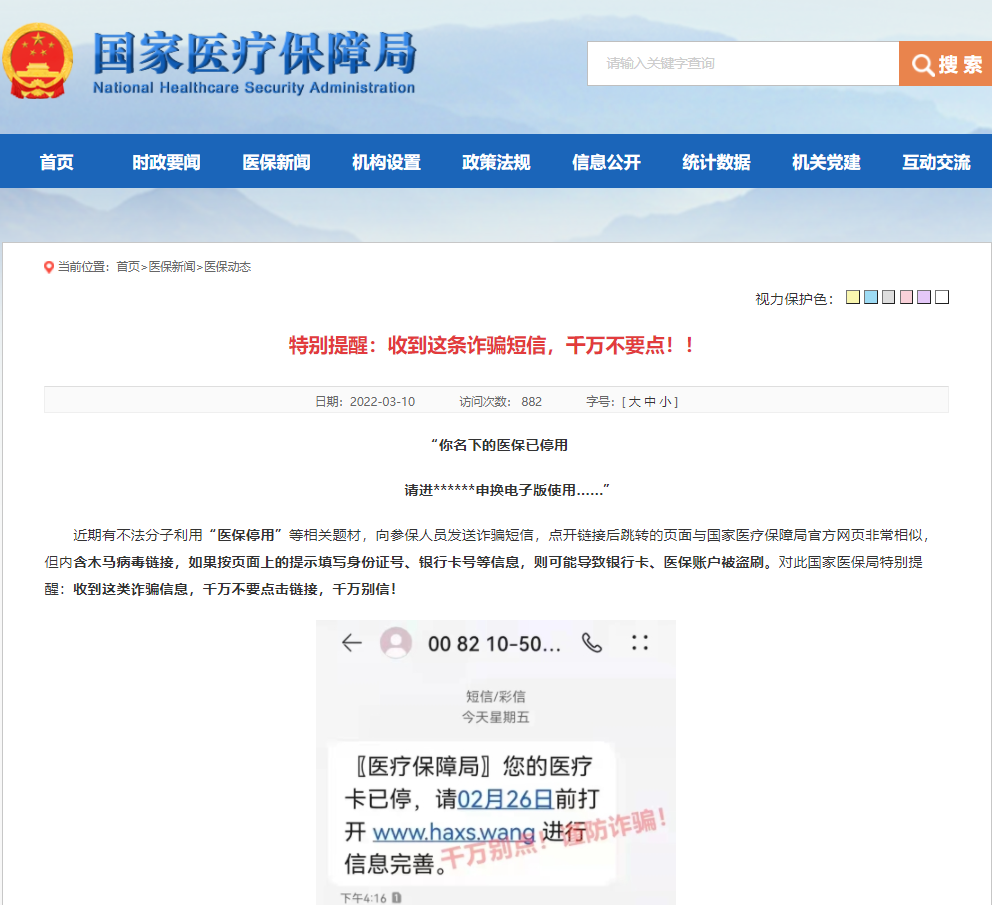 近期有不法分子利用“醫(yī)保停用”等相關題材,向參保人員發(fā)送詐騙短信,點開鏈接后跳轉的頁面與國家醫(yī)療保障局官方網頁非常相似,但內含木馬病毒鏈接,如果按頁面上的提示填寫身份證號、銀行卡號等信息,則可能導致銀行卡、醫(yī)保賬戶被盜刷。