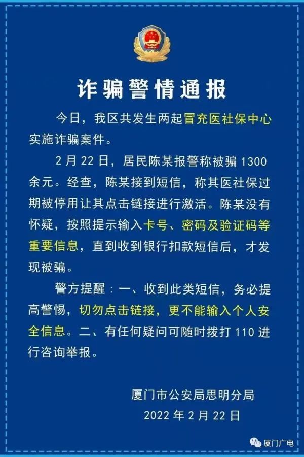 近日,廈門市民陳某也收到醫(yī)社保過期短信,陳某點擊鏈接進行激活,結果被騙1300余元。