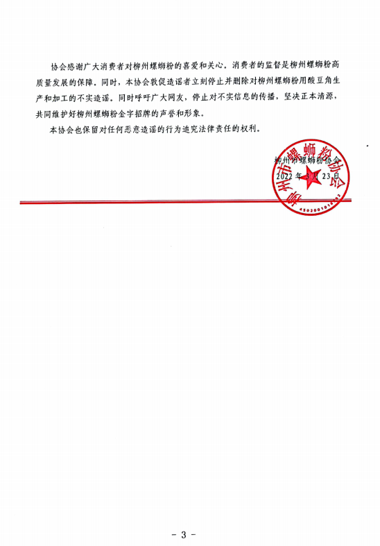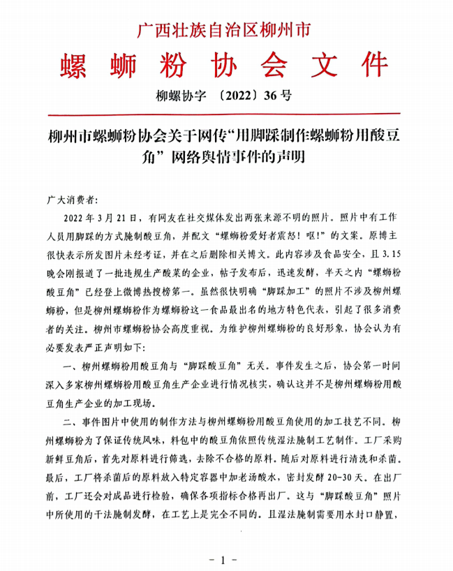 3月21日晚,柳州市螺螄粉協(xié)會(huì)針對(duì)近期網(wǎng)傳“用腳踩制作螺螄粉用酸豆角”一事發(fā)表聲明,敦促造謠者立刻停止并刪除對(duì)柳州螺螄粉用酸豆角生產(chǎn)和加工的不實(shí)造謠。同時(shí)呼吁廣大網(wǎng)友,停止對(duì)不實(shí)信息的傳播,共同維護(hù)好柳州螺螄粉金字招牌的聲譽(yù)和形象。