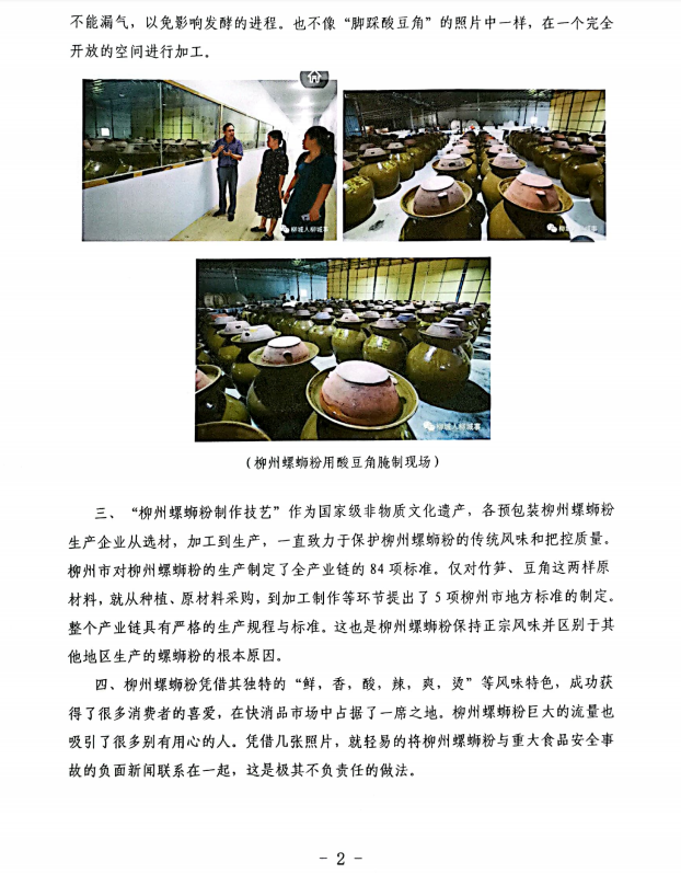 此外,柳州市螺螄粉協(xié)會(huì)表示圖片中使用的制作方法與柳州螺螄粉用酸豆角、酸筍使用的制作方法加工技藝不同。柳州螺螄粉為了保證傳統(tǒng)風(fēng)味,料包中的酸豆角和酸筍遵循依照傳統(tǒng)濕法腌制工藝制作,工廠采購(gòu)新鮮豆角和酸筍后,首先對(duì)原料進(jìn)行篩選,去除不合格的原料。隨后對(duì)原料進(jìn)行清洗和殺菌,最后工廠將殺菌后的原料放入特定容器中加老湯酸水,密封發(fā)酵 20-30 天。在出廠前,工廠還會(huì)對(duì)成品進(jìn)行檢驗(yàn),確保各項(xiàng)指標(biāo)合格再出廠。照片中所使用的干法腌制發(fā)酵,在工藝上是完全不同的。且濕法腌制需要用水封口靜置,不能漏氣,以免影響發(fā)酵的進(jìn)程。也不像“腳踩酸豆角”的照片中一樣,在一個(gè)完全開放的空間進(jìn)行加工。