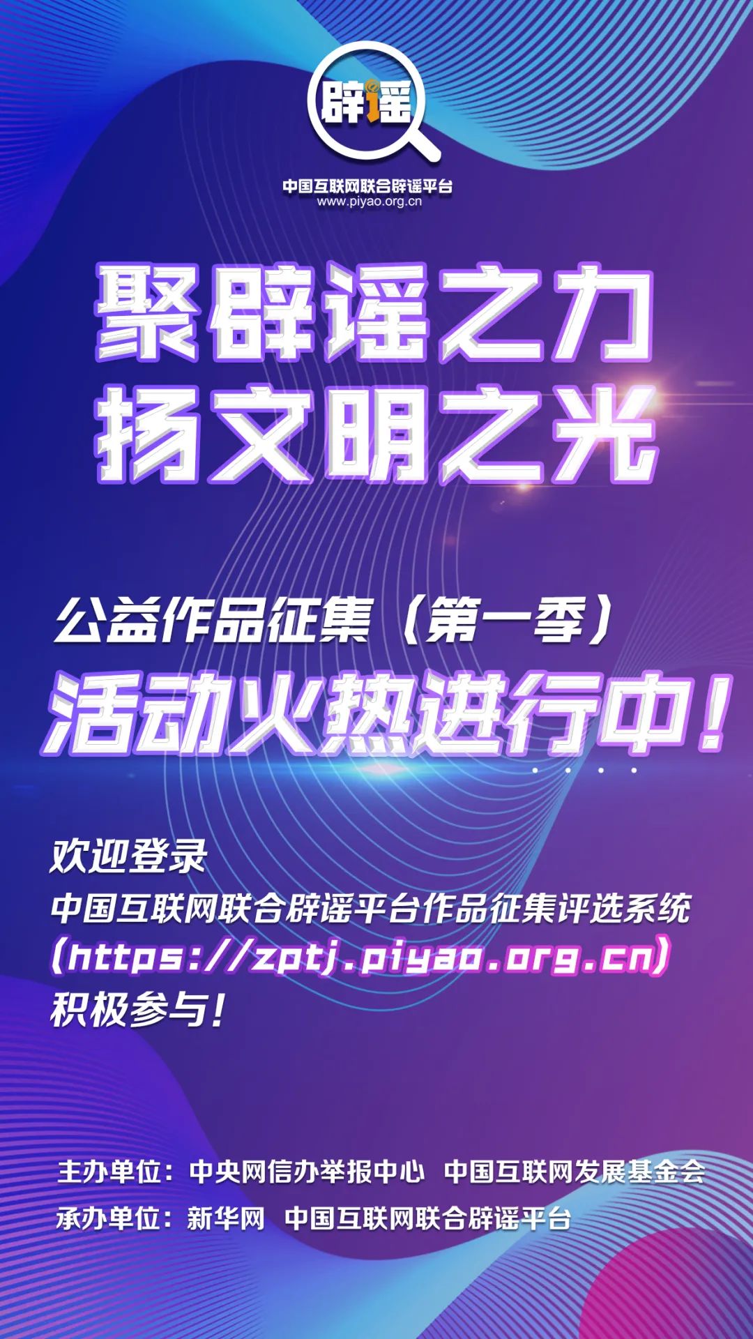 為匯“聚辟謠之力”,弘“揚文明之光”,提高全民辟謠的意識和唱響時代強音,推進網(wǎng)絡謠言共治,營造清朗網(wǎng)絡空間,中央網(wǎng)信辦舉報中心、中國互聯(lián)網(wǎng)發(fā)展基金會于2022年1月20日至5月20日開展“聚辟謠之力 揚文明之光”公益作品征集(第一季)活動,向社會征集公益作品。